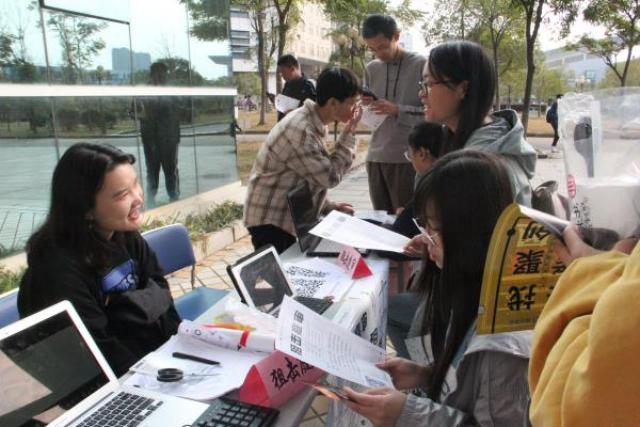 宣传活动伊始,委员们抱着宣传单走遍摆点处各个角落,寻找合适公司成员,并热情主动地为他们耐心讲解法学院学术节特色活动“狙击庭审”大赛的基本信息。参赛公司成员充满渴望的眼神和迫不及待的发问,体现大家对于学术节的热爱和对知识的渴望。同时,部长潘玥和副部长邓瑾哲始终坚守在法学院大本营摆点处,详细且耐心地回答前来大本营咨询的参赛公司成员任何有关比赛事项问题。潘玥、邓瑾哲及学术部各个委员配合默契、同心协力,为原本看似极其常规的摆点宣传活动更添一分色彩。