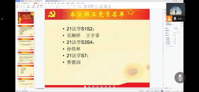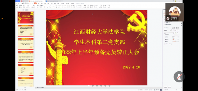 2022年4月20日下午3点30分,法学院本科生第二党支部在线上开展了预备党员转正大会,会议由支部副书记肖家鑫主持,讨论吴柳祥、王宇菲、孙伟林、胥德润同志的转正事项。