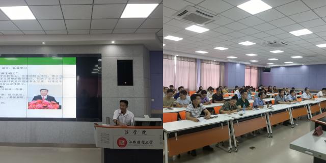 9月21日下午,法学院邀请学习会“十百千宣讲团”宣讲团成员、马克思主义学院江水法教授为学院全体教师作《习近平谈治国理政》第四卷的学习讲座。讲座以认真、真诚践行“两个确立”做前言,深刻阐述“两个确立”对新时代党和国家事业发展、对推进中华民族伟大复兴历史进程的决定性意义。随后,江水法对《习近平谈治国理政》第四卷包含的21个专题内容进行简要介绍,从紧抓意识形态工作、提高政治站位、坚持斗争精神等多个方面进行解读和交流。