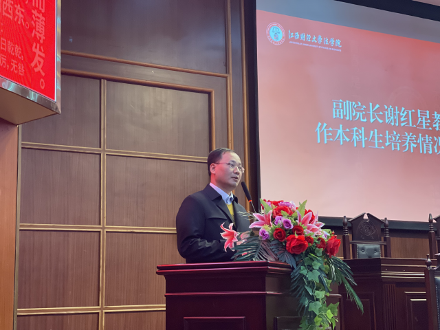 易有禄教授代表学院热烈祝贺2023级新生通过自己的努力实现了升学的目标,并由衷地欢迎大家加入江财法学院这个大家庭,为学院注入新的活力!随后,易有禄分别从学院历史、学科平台、师资力量、培养特色、学院社会影响等方面介绍了法学院的基本情况。他寄语全体2023级法学学子“学法悟理,心系家国”,深刻地认知法学专业究竟学什么以及如何学,持续去探索为什么学习法律?学法者的初心和使命到底是什么?除安身之外,我们还要立命。就是要有精神寄托,要有家国情怀。全体法学学子只有心系家国,才能极大地提高学法和从事法律职业的尊崇感和使命感,也惟有心系家国,将个体价值的实现和国家民族的命运紧密联结在一起,才能在全面推进依法治国的新征程中走得更远、飞得更高!