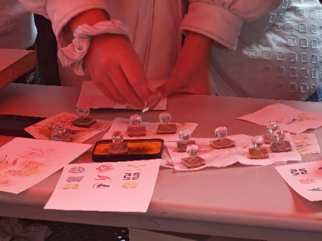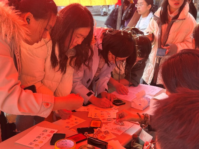 活动尾声的集章环节为现场增添了更多惊喜。完成汉服知识问答的同学可自行集章,精美的“十二章纹“图案,不仅是对知识掌握的认可,更是一份独特的文化纪念。看着纹样在卡片上渐渐完整,同学们的笑容里满是对传统文化的喜爱,更洋溢着收获的满足与自豪。