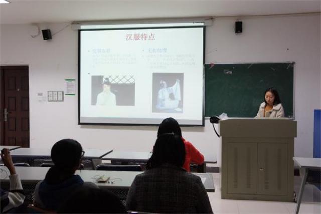 大屏幕上所放映的各类华丽汉服的图片为在场学子展现了古人身穿汉服翩翩风度、温婉大方的姿态。随后讲解员以“有服饰之美谓之华,有礼仪之大为之夏”解释了华夏一词的由来,同时说明了华夏族演变为汉族的史实。她从何为汉服的层面出发,提出了汉族复兴汉服的根本原因——汉服文化遭到了满清统治者的毁坏,是朝代更迭的受害者。作为华夏子孙,我们应当承担起复兴华夏文化重要内容汉服的历史使命。