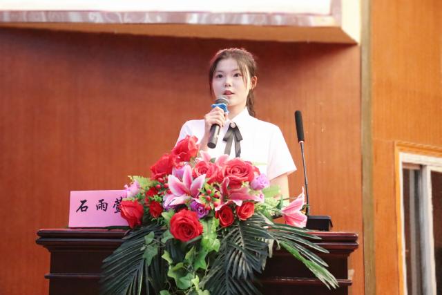 法学252班石雨萱同学将赣鄱大地的红色文化与百年江财的校训精神融合在一起,阐述了属于江财法律人从革命年代“枪杆子”捍卫家国,到新时代“笔杆子”守护法治的历史传承和时代使命。作为2025级新生代表,她呼吁全体同学从脚下的这片英雄土地出发,以“信敏廉毅”为罗盘,以法治理想为风帆,开启法学征程,以青春之我,奋斗之我,为法治中国建设贡献智慧力量,在民族复兴征程中,书写属于2025级法学人的精彩华章!