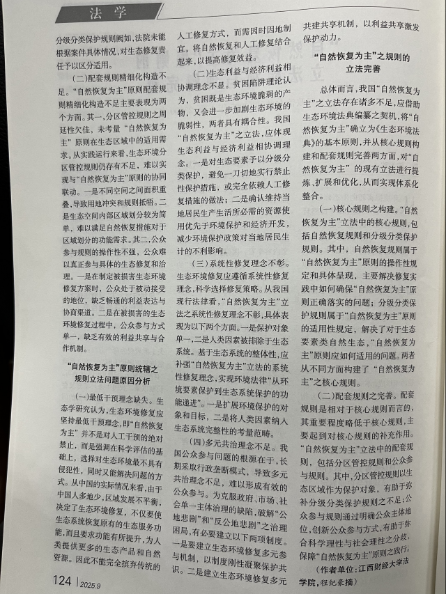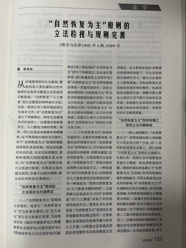 陈幸欢副教授发表于CLSCI期刊《政治与法律》2025年第4期的论文《“自然恢复为主”原则的立法检视与规则完善》,为《中国社会科学文摘》转载。