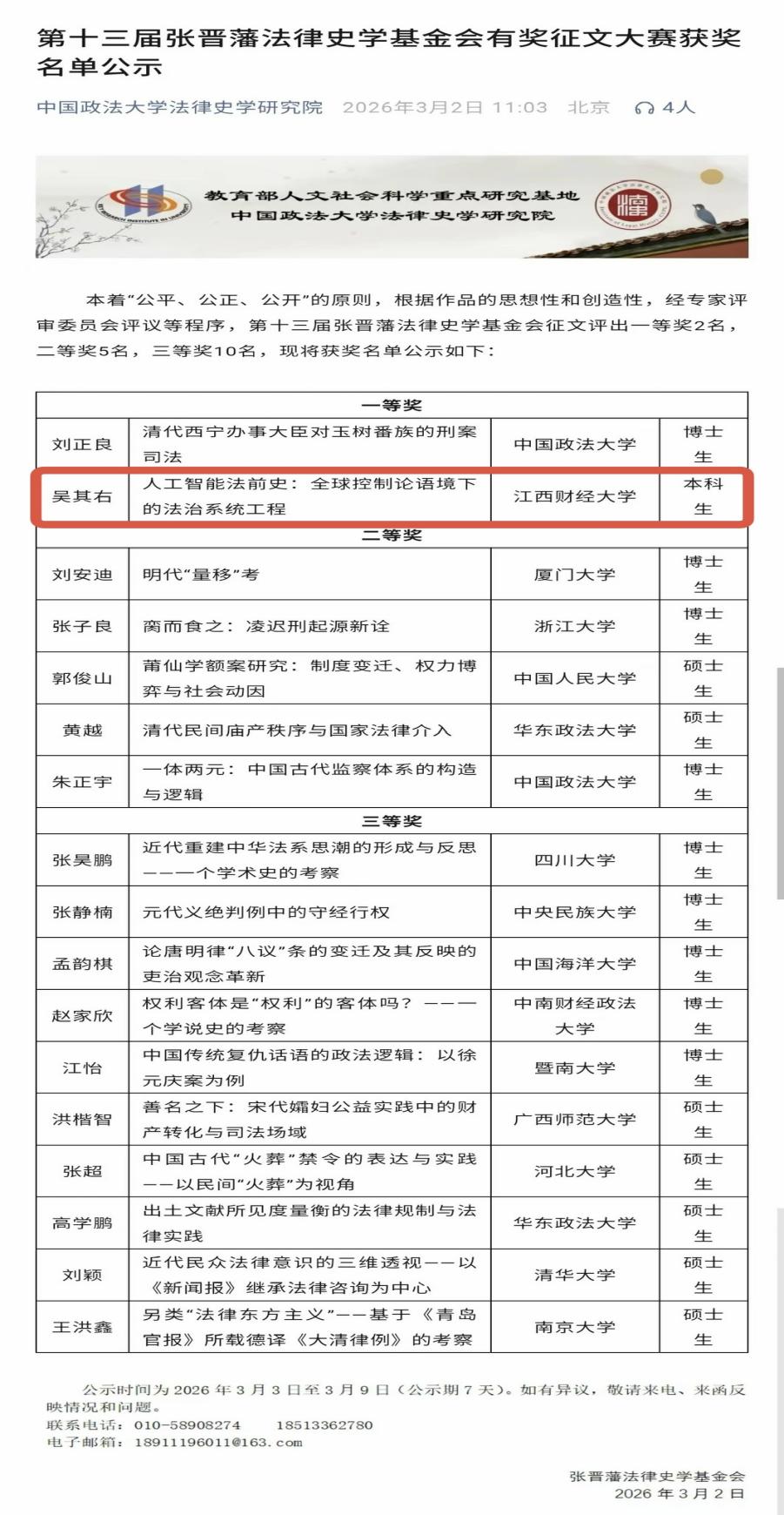 3月2日,第十三届“张晋藩法律史学术基金会”全国法律史学学生征文评选结果正式公示。经专家评审委员会多轮严格评议,我院本科生吴其右同学凭借扎实的学术积淀与独到的科研视角,荣获一等奖。这一成绩不仅是其个人潜心钻研的成果,也客观展现了我院学子在全国高水平学术对话中稳健的专业素养与科研潜力。